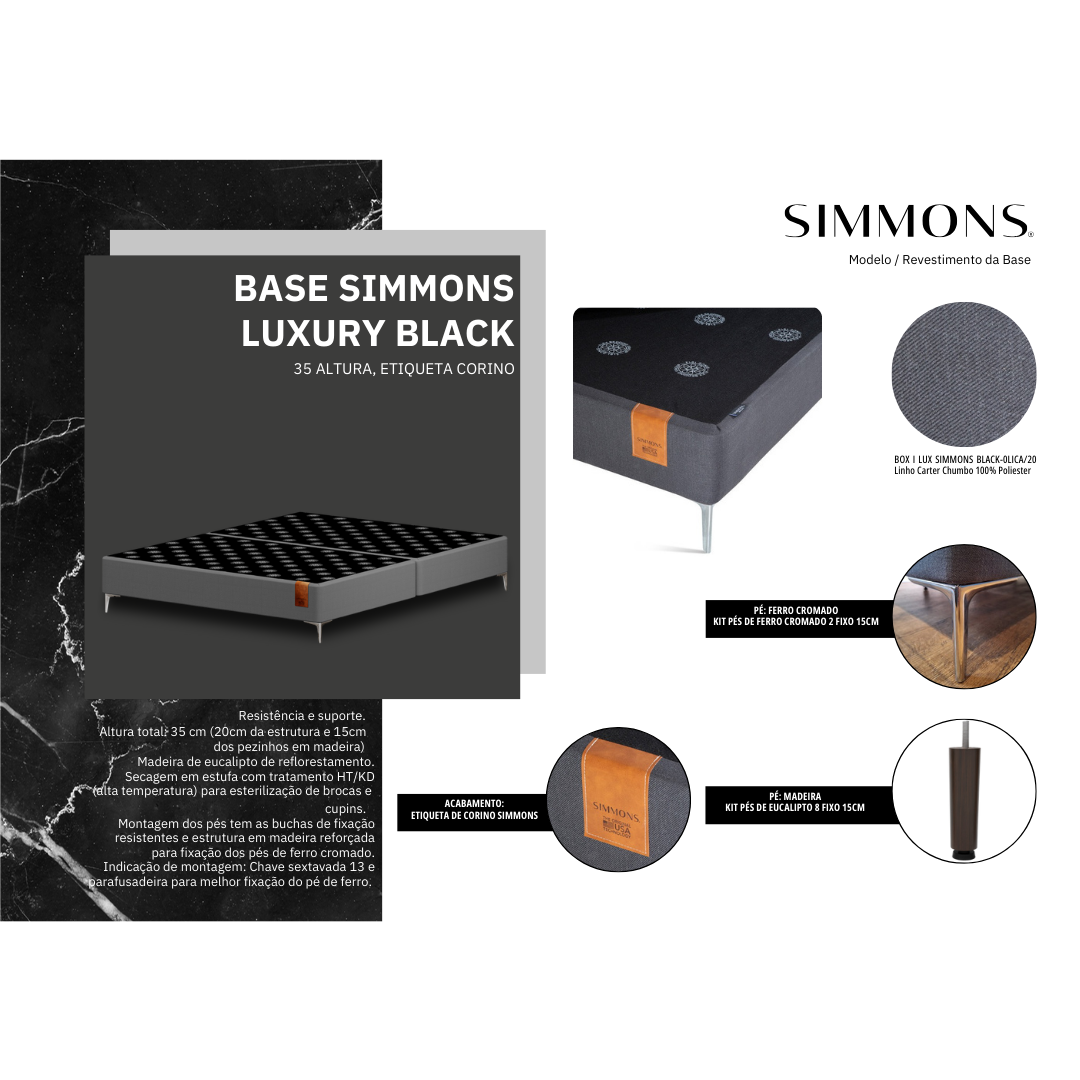 A Base Simmons I Luxury Black 96x203 oferece resistência, sofisticação e suporte ideal para o seu colchão. Produzida em madeira de eucalipto de reflorestamento, passa por secagem em estufa com tratamento HT/KD (alta temperatura), garantindo a esterilização contra brocas e cupins e maior durabilidade.